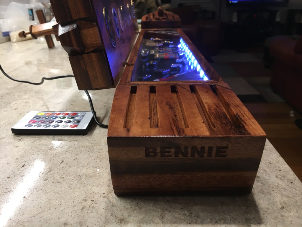 This was for a good friend. It has lights that frame it on light on the wall